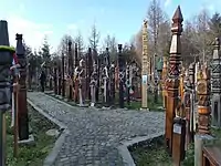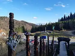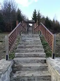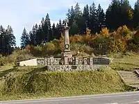 ![]() Imaginea Pasului Cașin, de pe treptele care suie spre cimitirul comemorativ. Se văd obeliscul ridicat de sculptorul italian Poulini, în 1897, iar în planul îndepărtat Munții Ciucului, care limitează Depresiunea Cașin. | |