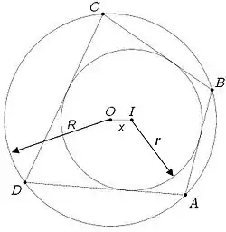 Această teoremă stabilește o relație între raza r a cercului înscris, raza R a cercului circumscris și distanța x dintre centrele acestora:
