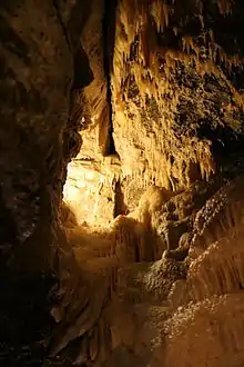 Ea a fost descoperită în anul 1971 cu ocazia unor lucrări cu exploziv la cariera de calcar. Peștera are o lungime de 600 de m poate fi vizitată numai cu ghid, fiind în apropierea unor altor peșteri care fac parte din sistemul carstic al regiuni. Aceste peșteri sunt apreciate că ar avea o vârstă de ca. 2 milioane de ani. Peștera are goluri care variază între 1,5 și 6 m înălțime. Printre curiozitățile din peșteră se poate aminti stalagmita numită „Tortul de nuntă”. Peștera este deschisă și pentru persoane handicapate, deoarece nu există trepte de urcat în peșteră.