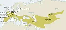 Producția de vârfuri de lance dintr-un miez de piatră de piatră, tehnica Levallois, Cultura mousteriană, peștera Tabun, 250.000-50.000 BP