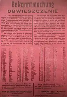![]() Anunțul cu privire la executarea a 100 de ostatici polonezi ca represalii pentru uciderea a 5 polițiști germani și un membru al SS de către luptătorii Armia Krajowa |