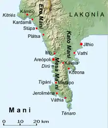 - Mesa Mani (Μέσα Μάνη) sau Mani Interior în sud-vest.