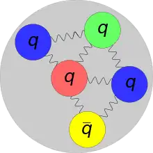 Quarcurile având un număr barionic de +1⁄3, iar antiquarcurile de −1⁄3, acesta ar avea un număr barionic total cu valoarea 1, prin urmare fiind clasificat ca un barion exotic. Prin contrast, barionii obișnuiți (sau „triquarcuri”)—care de asemenea au un număr barionic total cu valoarea 1—sunt formați din trei quarcuri. Numele „pentaquark” a fost propus de Harry J. Lipkin în 1987,[1] cu toate că posibilitatea existenței particulelor cu 5 quarcuri a fost identificată din 1964 când Murray Gell-Mann a postulat pentru prima dată existența quarcurilor.[2] Deși preziși cu decenii în urmă, pentaquarcurile s-au dovedit a fi surprinzător de dificil de descoperit, unii fizicieni începând să suspecteze că o lege necunoscută a naturii împiedică producerea lor.[3]
