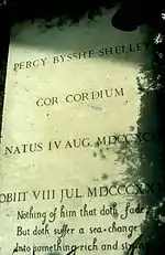 Cenușa rezultată din incinerare a fost trimisă într-o urnă la Roma și îngropată (la 7 decembrie) în cimitirul protestant, sub o lespede simplă, pe care a fost gravată următoarea inscripție a lui Hunt: PERCY BYSSHE SHELLEY, COR CORDIUM, NATUS IV AUG. MDCCCXCII, OBIIT VII JUL. MDCCCXXII (Percy Bysshe Shelley, Inima inimilor, născut la 4 aug. 1792, mort la 8 iul. 1822). Iar dedesuptul acestei inscriții lapidare, Trelawny a ținut să adauge trei stihuri din Furtuna lui William Shakespeare pe care Shelley le recita adesea:
