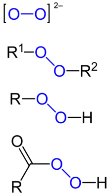 Structura chimică a unor tipuri de peroxizi: ion peroxid, peroxid organic, hidroperoxid organic, peracid. Grupa peroxid este colorată în albastru. R, R1 și R2 resturi hidrocarbonate.