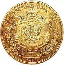 Nikola I al Muntenegrului reprezentat pe o monedă de aur, cu valoarea nominală de 100 de perper muntenegreni, din 1910, an în care el a început să folosească titlul de rege