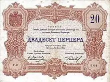 Bancnotele au fost tipărite în 1912, având cupiuri de 1, 2, 5, 10, 50 și 100 de perperi. În 1914, guvernul a emis trei serii de bancnote, având valorile nominale de 1, 2, 5, 20, 50 și 100 de perperi. În timpul ocupației austriece, bancnotele din seriile a II-a și a III-a au primit supratipar la ordinul comandanților districtuali ai guvernului militar. În 1917, armata austriacă a emis vouchere în perperi convertibili și monede metalice în perperi (Münzperper) și coroane austro-ungare, cu o rată de schimb de 2 perperi = 1 perper monedă (Münzperper) = 1 coroană austro-ungară.
