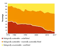Partea stocurilor de pește care se încadrează în nivelul biologic prielnic a prezentat o tendință de scădere, de la 90% în anul 1974 la 66,9% în anul 2015. În schimb, procentul stocurilor pescuite la niveluri biologice neprielnice, a crescut de la 10% în anul 1974 la 33,1% în anul 2015, cu cele mai mari creșteri la sfârșitul anilor 1970 și 1980.