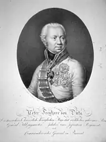 În cele din urmă, pe 22 aprilie 1815 la Viena, generalul a fost ridicat de împărat în rangul de baron al Boemiei cu incolat, apoi, la 26 iulie 1816 tot acolo, ca baron maghiar, consilier privat, de asemenea consilier și conferențiar de stat.[10][11]