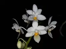 - Phalaenopsis equestris var. aurea — flori albe cu o labelă galbenă solidă.
