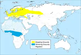 | Arealul. Galben: Arealul de reproducere (oaspete de vară) | |