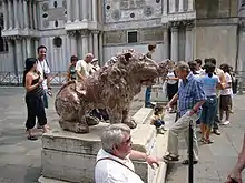În 1722 au fost plasați în piață cei două lei din piatră care i-au dat numele actual, în timp ce între 1837 și 1870 a fost consolidat aspectul final prin reconstrucția Palatului Patriarhal, ce a încorporat aripa veche a Palatului Ducal care avea fațada principală în piață.