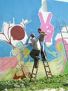 - Graffiti. Este o vopsea ambalată în cutii de spray și utilizată prin apăsarea unui buton de deasupra lichidului, care vine într-un pulverizator fin, folosită pe suprafețe mari, de multe ori pe pereții de pe străzi. Romanii și grecii foloseau această metodă pentru a-și exprima ideile public, pe stradă.[27] Graffiti nu a avut inițial sensul cunoscut astăzi, inscripțiile murale reprezentând o formă de exprimare acceptată de toți oamenii din comunitatea respectivă, o formă legală și chiar încurajată.[27] Astăzi, exprimarea graffiti este asociată în primul rând ideii de vandalism.[27] Orice desen care se realizează pe un perete exterior fără acordul proprietarului, este considerat un delict și este pedepsit în funcție de gravitate.[27] Locul unde s-a dezvoltat cel mai bine acest mod de manifestare stradal a fost orașul New York.[27]