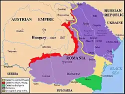 - În martie 1918, prin Pacea de la București, România, înfrântă de armatele austro-germane și bulgare, a fost silită să cedeze Austro-Ungariei o fâșie de teritoriu de-a lungul Carpaților, Bulgariei, Dobrogea la sud de linia Rasova-Agigea, și Puterilor Centrale restul Dobrogei până la brațul Sfântu Gheorghe; a redobândit aceaste teritorii după Unirea din 1918 prin Tratatele de pace de la Saint-Germain, de la Trianon și de la Neuilly;