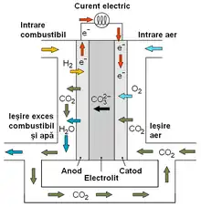 Ionii de CO32– se formează la catod din CO2, deci catodul trebuie alimentat și cu CO2, nu numai cu O2. Drept sursă de CO2 se poate folosi cel separat din gazele generate la anod, adus la catod printr-un circuit de recirculare. Ionii de carbonat traversează electrolitul și la anod revin la CO2.