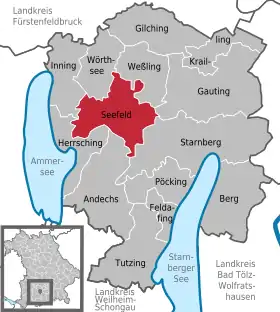 - Seefeld: În 1150, teritoriul este menționat în documente vechi ca Sevuelt (încă fără castel) și a aparținut Domnilor de Weilheim, apoi, din 1318, Domnilor de Seefeld. Castelul Seefeld clădit acolo a fost pomenit pentru prima dată în 1302 sub numele Feste Schlossberg (Fortăreața Schlossberg). După moartea ultimului succesor masculin al acestei familii, posesiunea a trecut prin mâinile mai multor familii de nobili, până în cele din urmă, conții de Toerring-Seefeld au moștenit teritoriul cu castel în 1472. În secolul al XVIII-lea, clădirea a fost transformată parțial într-un palat baroc de către feldmareșalul conte Felix Ignaz de Toerring-Jettenbach.[2] În prezent aria cu lacul și castelul aparțin contelui Hans Caspar Graf (conte) zu Toerring-Jettenbach (2017).[1] Biserica Sf. Petru și Pavel este situată în carterul Oberalting și se prezintă în prezent în stil baroc și neogotic, dar are o istorie de 1200 de ani.[3]