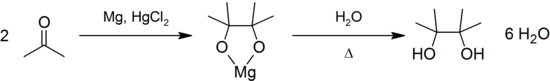 Pinacolul se poate obține în urma reacției de condensare pinacolică, plecând de la acetonă:[3]