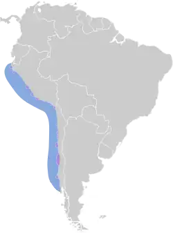 | Aria de răspândire a pinguinilor Humboldt. 80% din populația lumii trăiește în zonele protejate din regiunile nordice ale Chile III și IV. | |