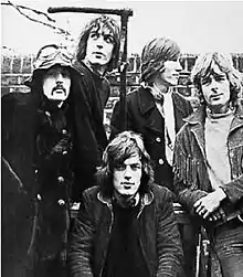 ![]() Pink Floyd în ianuarie 1968, aceasta fiind singura poză cunoscută cu toți cei cinci membri ai trupei. De la stânga la dreapta: Nick Mason, Syd Barrett, David Gilmour (așezat), Roger Waters și Richard Wright | |