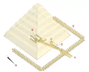 Intrarea în structura subterană se întinde spre sud, începând cu un pasaj îngust care coboară aproximativ 60,96 m până la un puț vertical pe partea de sus a coridorului. În acest loc, un alt pasaj duce la un rând de 136 de galerii neterminate, care formează o formă U în jurul piramidei.[10] Două dintre astfel de galerii apar chiar înainte de intrarea în camera mortuară cu o dispoziție similară, fiind și ele neterminate.