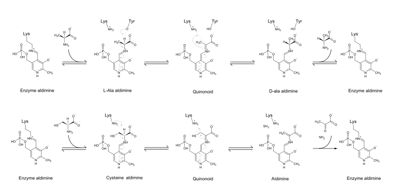 În reacțiile de transaminare, după deprotonare, intermediarul chinonoid acceptă un proton într-o altă poziție, formând o cetimină, care prin hidroliză va reforma o grupă aminică.[6]
