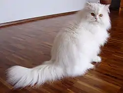 Corpul este compact și de mărime medie, pieptul lat, cu umeri masivi, picioarele sunt scurte, groase și puternice, cu labe mari și rotunde. Coada este scurtă și stufoasă. Face parte din categoria pisicilor cu păr lung. La pisica persană, speranța de viață este de 12 până la 17 ani.