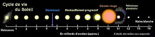 Când se va întâmpla acest lucru Soarelui, el se ca extinde și va înghiți planetele Mercur, Venus și Pământ. Mai târziu se va prăbuși pe el însuși, lăsând în urma lui o bună parte din gazele componente, pentru a forma o pitică albă înconjurată de o nebuloasă planetară.
