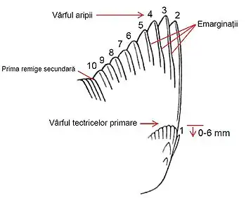 Formula alară: Prima remige primară este mai mică decât vârful tectricelor primare cu 0-6 mm (rareori mai mare cu 1,5 mm) și este mai mică decât a 2-a remige primară cu 40-52 mm. A 2-a remige primară este mai mică decât vârful aripii cu 1-4,5 mm, egală cu a 4-a/5-a remige primară (81%), egală cu a 4-a (18%) sau egală cu a 5-a sau a 5-a/6-a (1%). A 3-a remige primară este cea mai lungă. A 4-a remige primară este mai mică decât vârful aripii cu 0,5-2 mm. A 5-a remige primară este mai mică decât vârful aripii cu 3-7 mm. A 6-a remige primară este mai mică decât vârful aripii cu 7,5-13 mm. A 7-a remige primară este mai mică decât vârful aripii cu 11-16,5 mm. A 10-a remige primară este mai mică decât vârful aripii cu 16-24 mm. Prima remige secundară este mai mică decât vârful aripii cu 19-26 mm. Pe steagul extern al remigelor primare 3-4 există emarginații (scobituri), adesea și aproape de vârful remigei a 5-a, dar de obicei mai puțin evidentă.[22]