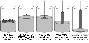 Plăcuțele sunt formate din material monocristalin de înaltă puritate (99,9999 %),[1] aproape lipsit de defecțiuni.[1] Pentru obținerea materialelor semiconductoare monocristaline, se utilizează procedee de creștere din topitură în incinte închise în atmosferă reducătoare de hidrogen. Un procedeu pentru formarea plăcuțelor cristaline este numit metoda Czochralski, inventată de chimistul polonez Jan Czochralski. Incintele închise sunt utilizate pentru creșterea monocristalelorde dimensiuni mari, evitându-se astfel impurificarea accidentală. Procesul este inițiat cu ajutorul unui germene monocristalin, care se coboară în topitură, se topește parțial și se extrage apoi treptat din topitură cu o viteză mică, între 1-2mm/min. Procedeul se bazează pe existența unui gradient de temperatură și pe migrarea moleculelordin starea lichidă către cristal, datorită răcirii. Semiconductorul topit cristalizează pe germene și repetă structura acestuia, obținându-se în final un lingou cilindric (bară) de siliciu cristalin de înaltă puritate ce are structura cristalină identică cu structura germenului.[2][3] Atomii impurităților dopante precum borul sau fosforul pot fi adăugați la siliciul intrinsec topit, în cantități precise, pentru a-l dopa (în vederea atingerii proprietăților electronice dorite), astfel schimbându-l în siliciu extrinsec de tip n sau tip p.