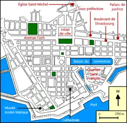 Plan al orașului Saint-Étienne și al centrului său organizat potrivit carelajului în jurul Grand'Rue.