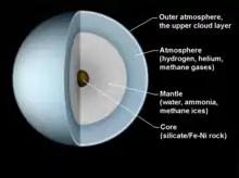Modelul standard al structurii lui Uranus este că planeta este formată din trei straturi: un nucleu stâncos (silicat/fier-nichel) în centru, o manta înghețată în mijloc și un înveliș exterior de hidrogen/heliu gazos.[10][56] Nucleul este relativ mic, cu o masă de numai 0,55 mase terestre și o rază mai mică de 20% din Uranus; mantaua cuprinde cea mai mare parte a planetei, cu aproximativ 13,4 mase terestre, iar atmosfera superioară este relativ nesubstanțială, cântărind aproximativ 0,5 mase terestre și extinzându-se în ultimii 20% din raza lui Uranus.[10][56] Densitatea nucleului lui Uranus este de aproximativ 9 g/cm3, cu o presiune în centru de 8 milioane de bari (800 GPa) și o temperatură de aproximativ 5000 K (4.727 °C).[55][56] Mantaua de gheață nu este de fapt compusă din gheață în sens convențional, ci dintr-un fluid fierbinte și dens format din apă, amoniac și alte substanțe volatile.[10][56] Acest fluid, care are o conductivitate electrică ridicată, este uneori numit ocean apă-amoniac.[57]