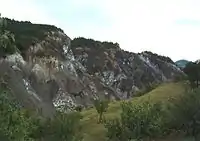 - Pe versantul stâng al văii Slănicului, se remarcă astfel blocuri de sare îngropate în argilă și marne sărăturoase, pe care s-au dezvoltat lapiezuri și ravene[3].
