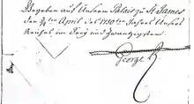 - (în română Astăzi, 21 decembrie 1785, ora zece dimineața, în adunarea Corpului Municipal, ținută în fața noastră Louis-Charles Lemenestrel, cavaler al Ordinului Regal Saint-Louis, consilier regal…)