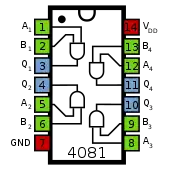 - Există o poartă NAND cu opt intrări (4068), și aceasta este ușor transformată într-o poartă AND cu opt intrări prin inversarea ieșirii.