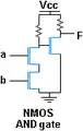 O poartă AND este de obicei creată folosind MOSFET NMOS sau PMOS, așa cum se arată în schemele de mai jos. Intrările digitale a și b produc ieșirea F, care are aceeași valoare ca și funcția AND.