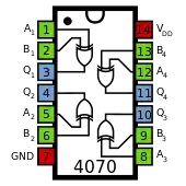 Porțile XOR sunt porți logice de bază, și de aceea sunt recunoscute în TTL și circuitele integrate CMOS. Circuitul integrat standard, seria 4000, CMOS este 4030 sau 4070, care includ patru porți independente cu două intrări.