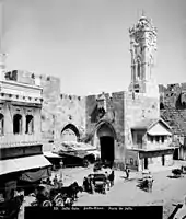 În 1907 a fost construit un ceas pe acoperișul Porții Jaffa, iar în 1908 a fost ridicat un turn cu ceas deasupra porții pentru a servi cartierul comercial în curs de dezvoltare în partea superioară a văii Hinom. El trebuia să fie unul din cele aproximativ o sută de turnuri cu ceas, ce urmau să fie construite în întreg Imperiul Otoman în 1900 pentru a celebra cel de-al 25-lea an al domniei sultanului Abdul Hamid al II-lea. Turnul a costat 20.000 de franci; starea de sărăcie a orașului a cauzat o strângere dificilă a banilor, iar turnul cu ceas a fost finalizat abia în 1908. El a rămas în picioare doar un deceniu, fiind dărâmat de britanici în 1922 din motive estetice.[7]