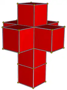 Tesseractul (hipercubul cvadridimensional) are opt cuburi ca fațete și, la fel cum un cub poate fi desfășurat într-un hexamino, tesseractul poate fi desfășurat într-un octacub. În special una dintre desfășurate este asemănătoare cu o cruce latină: constă din patru cuburi stivuite în coloană, cu alte patru cuburi lipite de celelalte fețe pătrate ale unui al doilea cub din coloană, pentru a forma o formă tridimensională, crucea Dalí. Salvador Dalí a folosit această formă în pictura sa Crucifixión (română Răstignire) din 1954. [10][11][12] Aceeași desfășurată a unui tesseract este esențială pentru intriga nuvelei —And He Built a Crooked House— (română Și el construi o casă în dungă, o casă în dungă) de Robert A. Heinlein.[13] Această desfășurată poate tesela spațiul.[11] Răspunzând la o întrebare pusă în 1966 de Martin Gardner, dintre cele 3811 de octacuburi diferite, 261 sunt desfășurare ale tesseractului.[11][14]