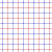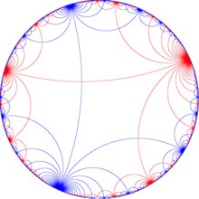 Pavarea apeirogonală de ordin infinit, {,} este cu roșu, iar duala sa cu albastru
