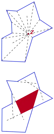 Formal, un poligon P are formă de stea dacă există un punct z astfel încât pentru fiecare punct p din P segmentul zp se află în întregime în P.[1] Mulțimea tuturor punctelor z cu această proprietate (adică mulțimea de puncte din care toate punctele lui P sunt vizibile) se numește nucleul lui P.