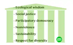 Potrivit lui Derek Wall, un proeminent susținător britanic al ecologismului, există patru piloni care definesc politica ecologică:[1]