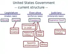 Puterea executivă era deținută de Președinte care înfruntă probleme și cutume. Sistemul constituțional a creat premisele unui conflict instituțional și nu a unei colaborări. Pentru a funcționa eficient, fără a fi coruptă, adunarea legislativă trebuia să fie numeroasă și formată din indivizi cu păreri și interese diferite. Experiență colonială anterioară a contribuit la dezvoltarea adunării legislative. Conducătorii erau alcătuiți din oameni cu interese diferite. De cele mai multe ori, aveau interese contrare în privința împărțirii terenurilor, apelor, pădurilor, și toate aceste dispute se rezolvau printr-o dezbatere. Negocierea continuă în interiorul adunării coloniale. Coloniștii americani doreau să fie reprezentați în Parlamentul Londrei. Congresul american era tulburat și fragmentat. Nu există o disciplină de partid, căci atât democrații și republicanii erau împărțit în grupuri ce puteau merge de la politici moderate la cele extremiste pe baza doctrinei partidului.