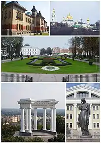 Centrul orașului vechi este o piață semicirculară neoclasică, în centru aflându-se o coloană toscană din fontă (1805-1811), ridicată pentru comemorarea centenarului bătăliei de la Poltava, turnată din metalul a 18 tunuri sudeze capturate în timpul bătăliei. Dat fiind faptul că Petru cel Mare a sărbătorit victoria în Biserica Mântuitorului, această veche biserică din lemn a fost păstrată și restaurată cu grijă de mai multe ori până în ziua de azi. Catedrala cu cinci turnuri a orașului, dedicată Zilei crucii, este un monument în construit în stil baroc căzăcesc între 1699 și 1709. O altă biserică dedicată Adormirii Maicii Domnului fost distrusă în 1934 și a fost reconstruită în ultimul deceniu al secolului trecut.