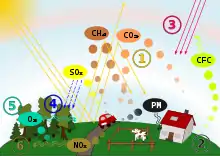 - Metanul, emis prin digestia alimentelor de către animale, de exemplu bovine.[2]