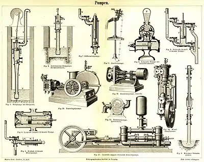 - Pompe rotative. Exemple: pompă cu palete, pompă cu roți dințate, pompă cu lanț și roată dințată (variantă: pompă cu dopuri), pompă cu șurub (pompa lui Arhimede), pompă cu rotoare profilate.