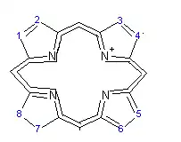 Nucleul porfirinic este de tip polienic, cu structură plană, fapt confirmat de cristalografia cu raze X. Energia de conjugare de circa 250 kcal/mol, mult mai mare decît a celor patru nuclee, explică marea stabilitate chimică și caracterul aromatic. Sistemul aromatic este format din 22 electroni pi, dar numai 18 sunt delocalizați; nucleul porfirinic îndeplinește condiția stării aromatice impuse de regula lui Hückel (4n + 2 pi electroni unde n=2). Spectrul RMN a mezo protonilor (protonii implicați în punțile metilenice care leagă nucleele pirolice) au o valoare de 8-10 ppm, în timp ce semnalul electronilor de la N corespunde unei valori de -2-4 ppm.