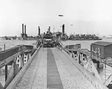 Un drum plutitor Whale dintre rampa de descărcare și portul Mulberry A în dreptul plajei Omaha