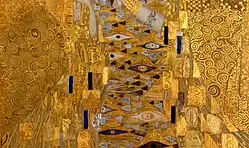 Una din cele mai renumite picturi ale lui Klimt este „Sărutul” (1907-1908). Ea datează din așa-numită „perioadă de aur” a artistului. Acest lucru este ilustrat cel mai bine de petalele aurii ce luminează fosforescent scena intimă a sărutului. Măiestria decorativă a lui Klimt se poate observa pe exemplul oferit de covorul de flori întins la picioarele celor doi îndrăgostiți, pe care figurile unite în îmbrățișare au încremenit într-o imobilitate statuară.