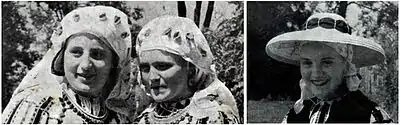 - Bătrânele își mai amintesc de încă două piese nelipsite din "garderoba" de până în primele decenii ale secolului al XIX-lea: "vălitoarea" și "conciu". Prima, formată dintr-o bucata de voal alb, de lungime apreciabilă, se purta în zilele de sărbătoare, peste "cârpă", însă numai de către femeile în vârstă, fiind folosită și la înmormântare. A doua, respectiv "conciul", cunoscut în alte părți ale județului Sibiu și sub denumirea de "coif"[3], se purta numai de mirese, când erau scoase "la Vale"(în centru). El se confecționa dintr-un cadru de sârmă, carton etc., de forma circulară, acoperit cu pânză, pe care se prindeau buchete de flori artificiale, monede vechi de argint, oglinjoare, ace cu gămălia colorată etc.