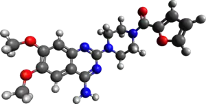 Prazosina este un medicament antihipertensiv, fiind utilizat în tratamentul hiperplaziei benigne de prostată și al hipertensiunii arteriale.[10] Acționează ca antagonist selectiv al receptorilor alfa-1, fiind un alfa-blocant. Este un derivat de chinazolină.[10] Calea de administrare disponibilă este cea orală.[10]